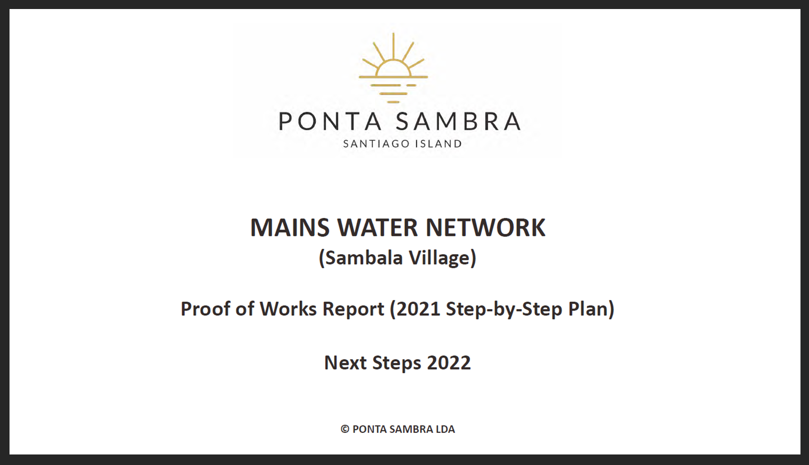 A comprehensive report on mains water at Sambala Village including an overview of the works cash flowed by Ponta Sambra in 2021 to re-activate the mains water network and the final simple steps to provide mains water to every property in 2022.